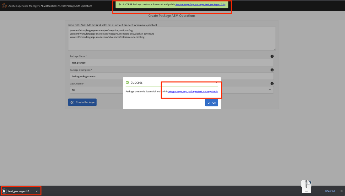 Package Creator is an extension of the ACS Commons Package handler, but it’s UI friendly and easy to access. You can input the paths to be packaged as a line feed and no need to separate them by a comma. Once the package is ready it will be built and prompted with a download option.