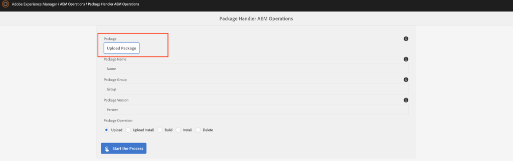 Now you can access the package handler and upload the packages to AEM as an upload or upload and install.
